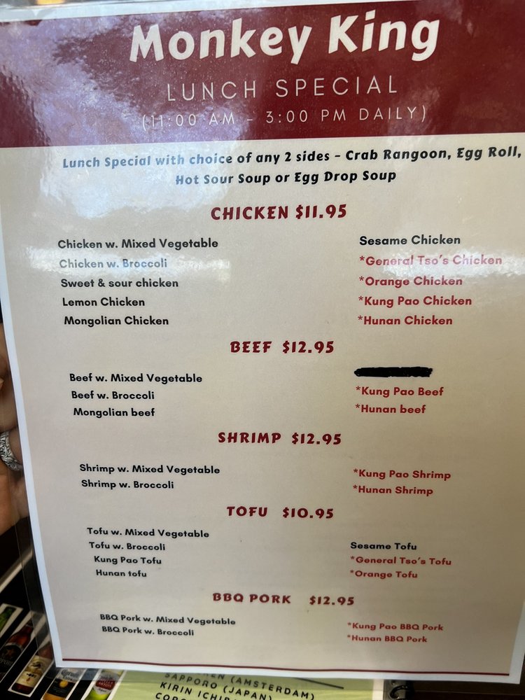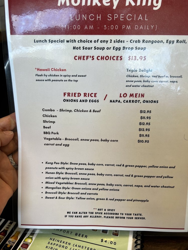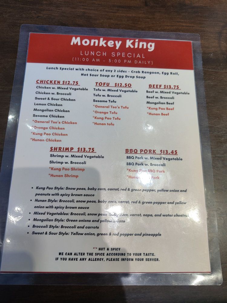 Monkey King BBQ & Noodle, located in Lenexa, KS, offers a delightful Cantonese dining experience. With a variety of vegan and vegetarian options, along with QR code menus available for convenience, this casual spot is perfect for dinner with friends or family. Customers rave about the flavorful dishes, such as the pork belly, fried noodles, and salt and pepper shrimp. The service is efficient, with fast food delivery and accommodating staff. Despite the vintage ambiance, the food speaks for itself and entices visitors to come back for more. Whether you're craving authentic Cantonese cuisine or looking for a new go-to Chinese spot, Monkey King BBQ & Noodle is sure to impress with its welcoming atmosphere and delicious offerings.